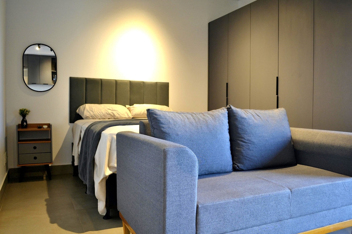 Apartamento moderno e aconchegante no coração da cidade. Desfrute de uma estadia confortável e elegante neste apartamento totalmente mobiliado, com design contemporâneo e acabamento de alto padrão. O espaço conta com uma sala acolhedora com TV e ar-condicionado, quarto com cama queen, banheiro moderno, cozinha completa e área de trabalho ideal para home office. Perfeito para quem busca praticidade e conforto, seja para curtas ou longas estadias.