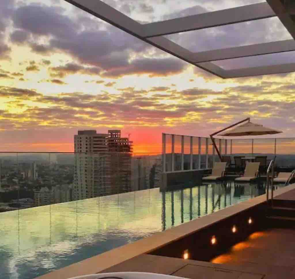 Ambiente espaçoso, contendo uma cozinha equipada com utensílios que permite o preparo de refeições, andar alto com vista panorâmica, condomínio completo: contendo academia 24h, piscina, sauna, restaurante, lavanderia, mercadinho, salão de beleza, estacionamento gratuito entre outras. O hóspede terá fácil acesso a tudo o que precisar neste lugar com excelente localização. Fica próximo aos melhores restaurantes, bares, farmácias, hospitais/clinicas e ao Parque Areião.