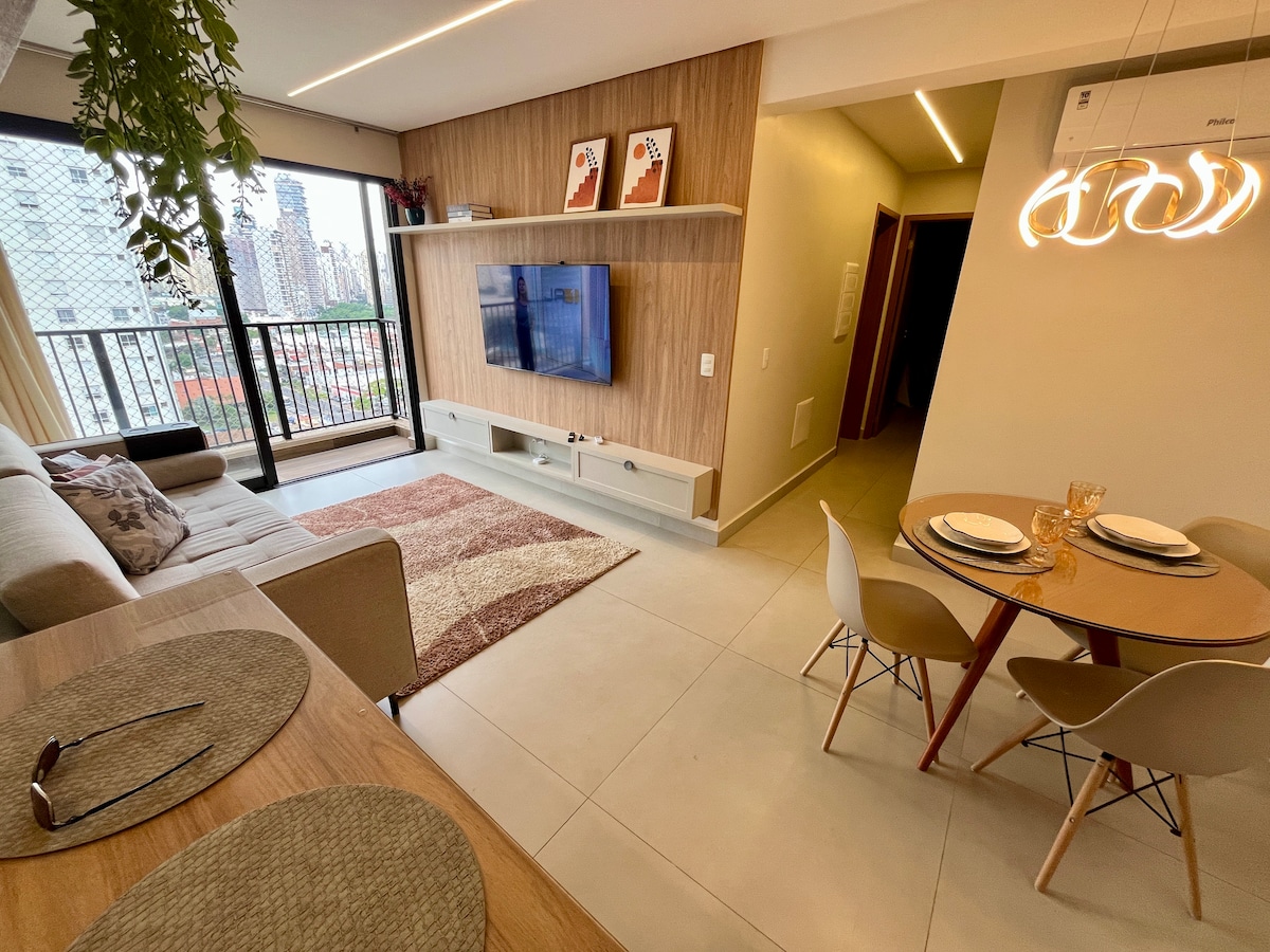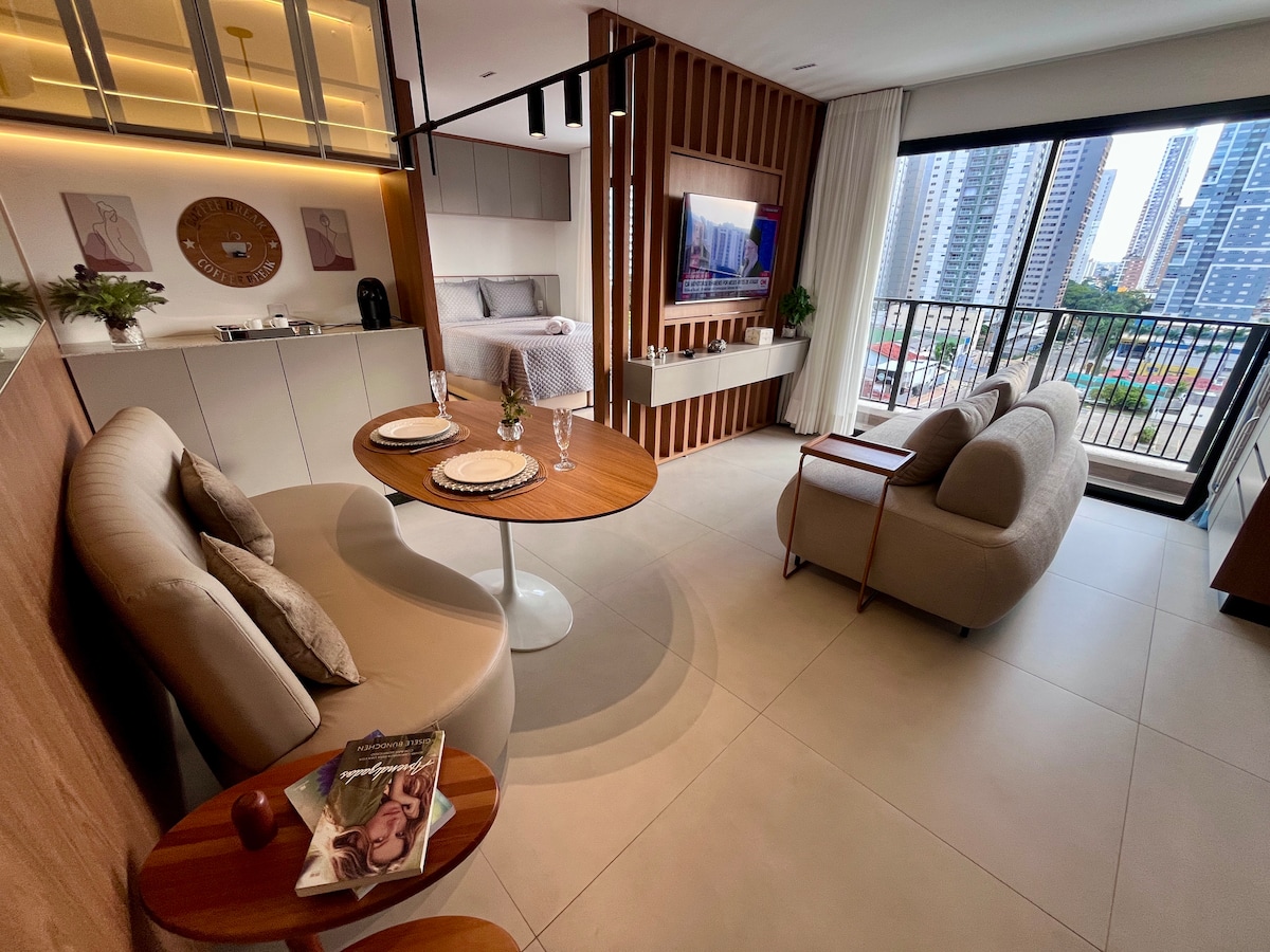🤩 Condomínio novo ❗️Um Ap único, elegante e sofisticado, feito para você se sentir em casa. Assista seu filme favorito no quarto ou na sala na mais moderna Smart TV giratória com ambiente com ar condicionado, mesa de jantar e espaço de trabalho dedicado. Repouse na melhor cama, delicie-se do chuveiro mais gostoso, aprecie a varanda e uma lindo por do sol com vista para o parque e desfrute do contemporâneo Setor Bueno na melhor região de Goiânia ! Condomínio Tai Residências