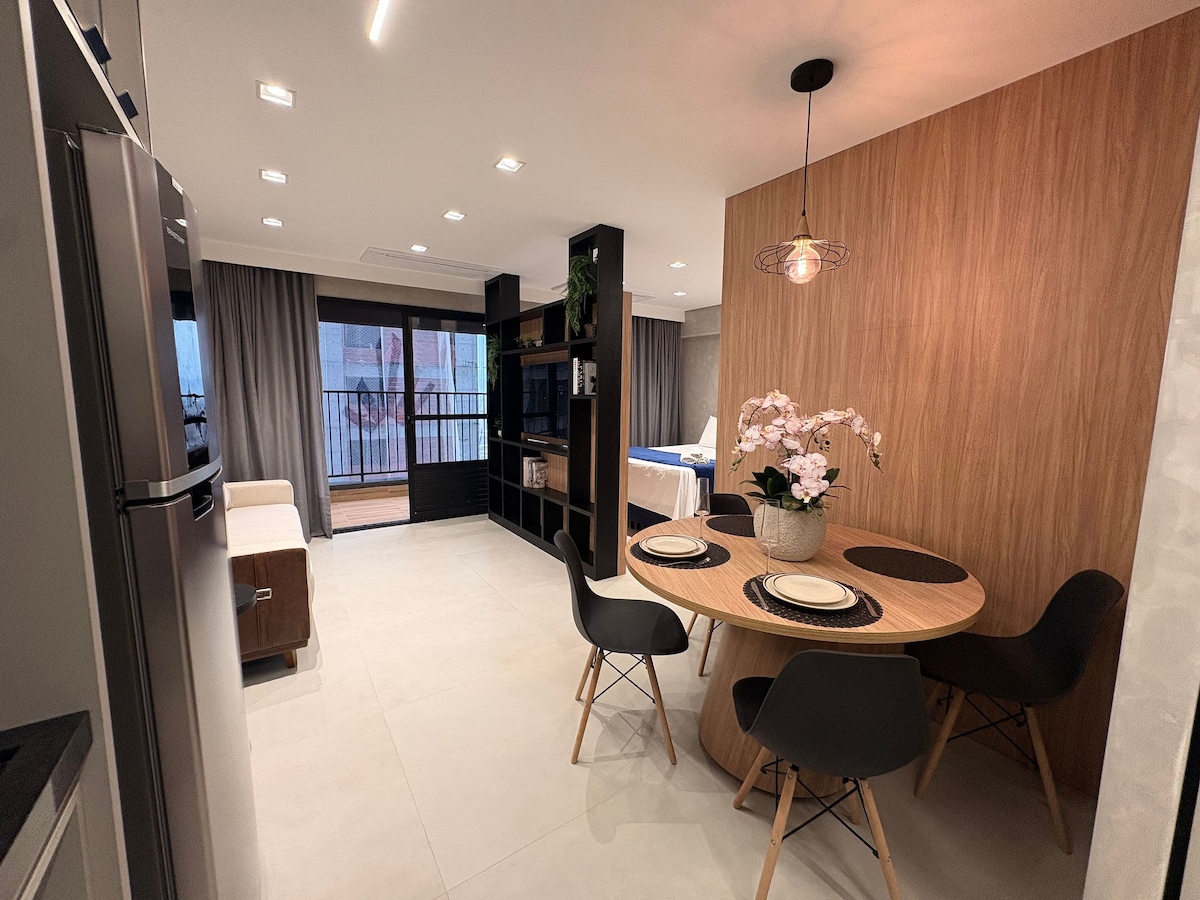 Apto 45 m2. Quarto:Cama Queen,armários,bancada escritório,TV 4K 50”,ar-cond.,roupa de cama/banho. Sala: sofá cama,TV 4K 50”,ar-cond.,mesa e 4 cadeiras design italiano. Cozinha:armários,bancada,cooktop 4 bocas,geladeira,forno elétrico,forno microonda,cafeteira elétrica,filtro água,sanduicheira, panelas,utensílios. Piscina borda infinita, hidro,sauna,academia,brinquedoteca,salão festa,espaços gourmet. 1 vaga garagem. Portaria 24 horas porteiro e segurança. Temos outro apto