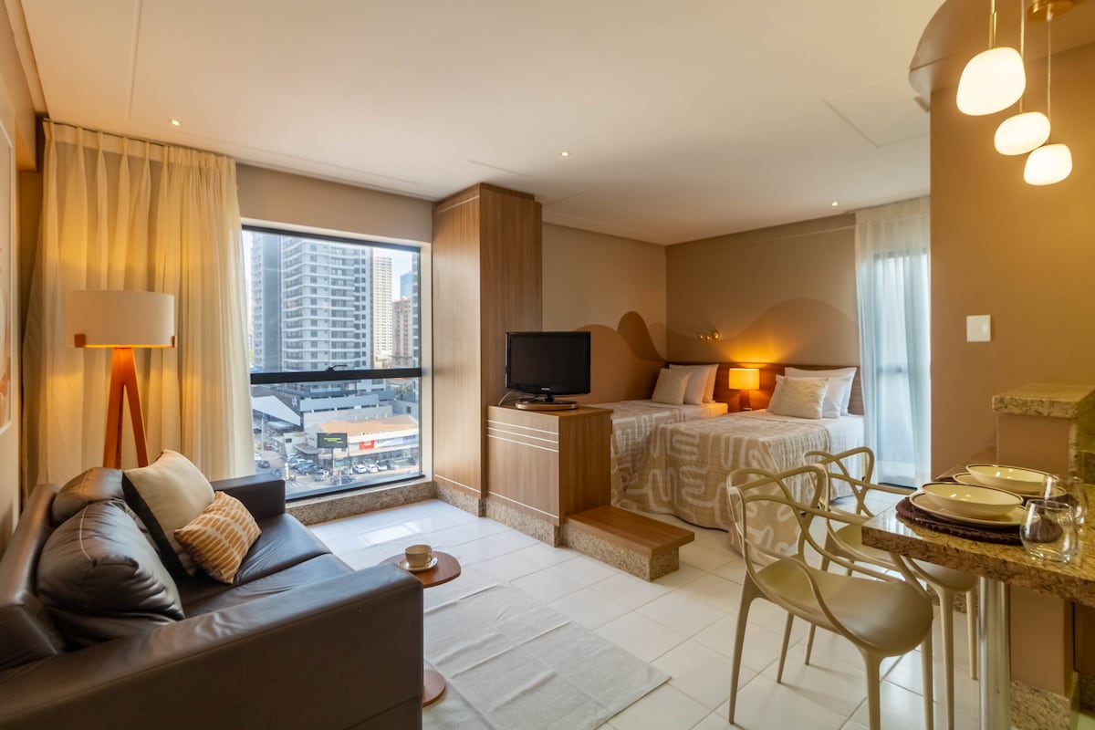 Flat equipado com uma cama box queen size, mesa para notebook, guarda roupas, armários de copa, frigobar, micro-ondas, sofá, ar condicionado, bancada para refeição, 2 bancos, Smart TV (apenas para streaming, não tem TV aberta ou fechada) e Internet dedicada tipo wi-fi. Piso em cerâmica. Vaga de garagem coberta. Vista para a Praça do Sol! Excelente localização! Não há serviço incluso (limpeza e outros). Temos alguns utensílios de copa e roupa de cama. 2 adultos e 1 criança dormindo com os pais.