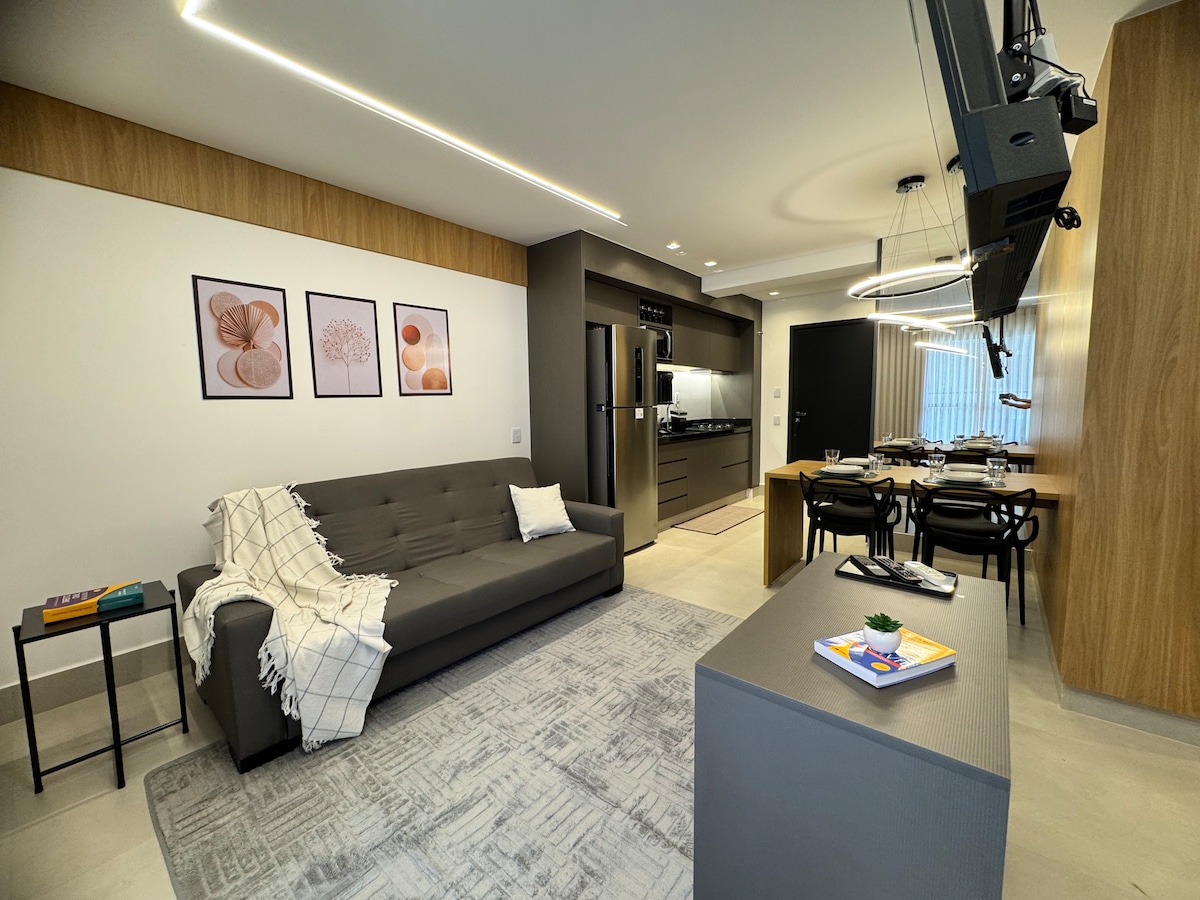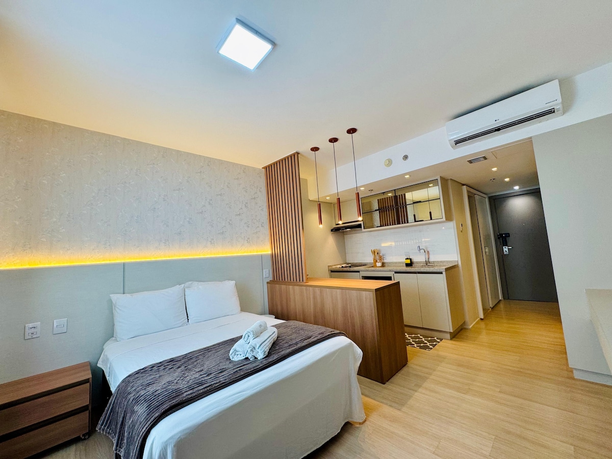 Studio moderno de 45 m² no alto do SETOR BUENO, na T-37 com a T-63. Próximo ao HOSPITAL Mater Dei, PARQUE Vaca Brava, Goiânia SHOPPING e ao eixo médico do ORION, ideal para lazer, consultas, exames ou trabalho. A região dispõe de Pão de Açúcar, Oba Hortifr, mercados, farmácias, cafeterias e ampla GASTRONOMIA. O espaço oferece cama QUEEN, cama auxiliar, ar, Wi-Fi rápido, Smart TV e COZINHA equipada, garantindo uma estadia confortável, funcional e acolhedora, perfeita para diferentes necessidades.