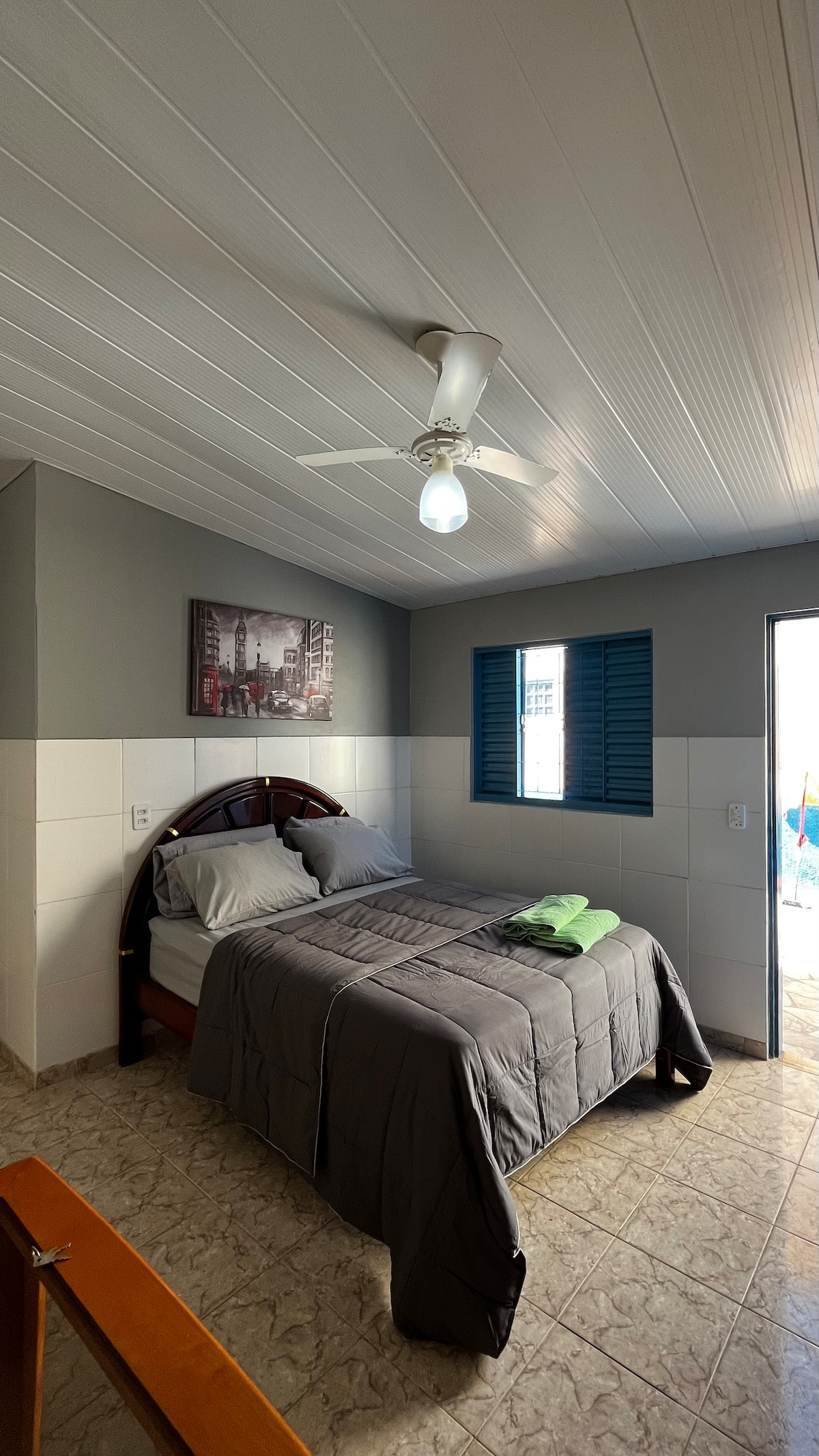 A casa fica a 950 metros da Praça do Coreto e do Mercado. Dois quartos, um com uma cama de casal, o outro com um futon de casal (cama de japonesa). quartos com ventiladores. Bichinhos de estimação são bem vindos! wi fi de qualidade. tv com mais de duzentos canais disponíveis. banheiro com box de vidro. A sala é ampla e há três sofás camas. ventilador na sala. Uma rede na sala e outra e quarto. A cozinha está equipada com todos os itens básicos. Há Churrasqueira no quintal.