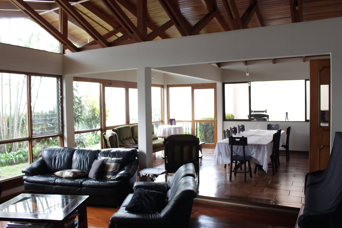 Casa Los Cielos is elegant but rustic, with beautiful Costa Rican woodwork throughout. Rooms all have stunning views including the San Jose valley and surrounding mountains. It is nestled in a cool (78F), peaceful mountainous area, is perfect for families, retreats, or groups of friends. Enjoy the chimney, fire pit, BBQ grill and horses in neigboring lot.Pets are welcome! - 20 min from downtown San Jose - 50 min drive to Int'l airport - 1h 45m from beach - 5 min drive to restaurants, stores