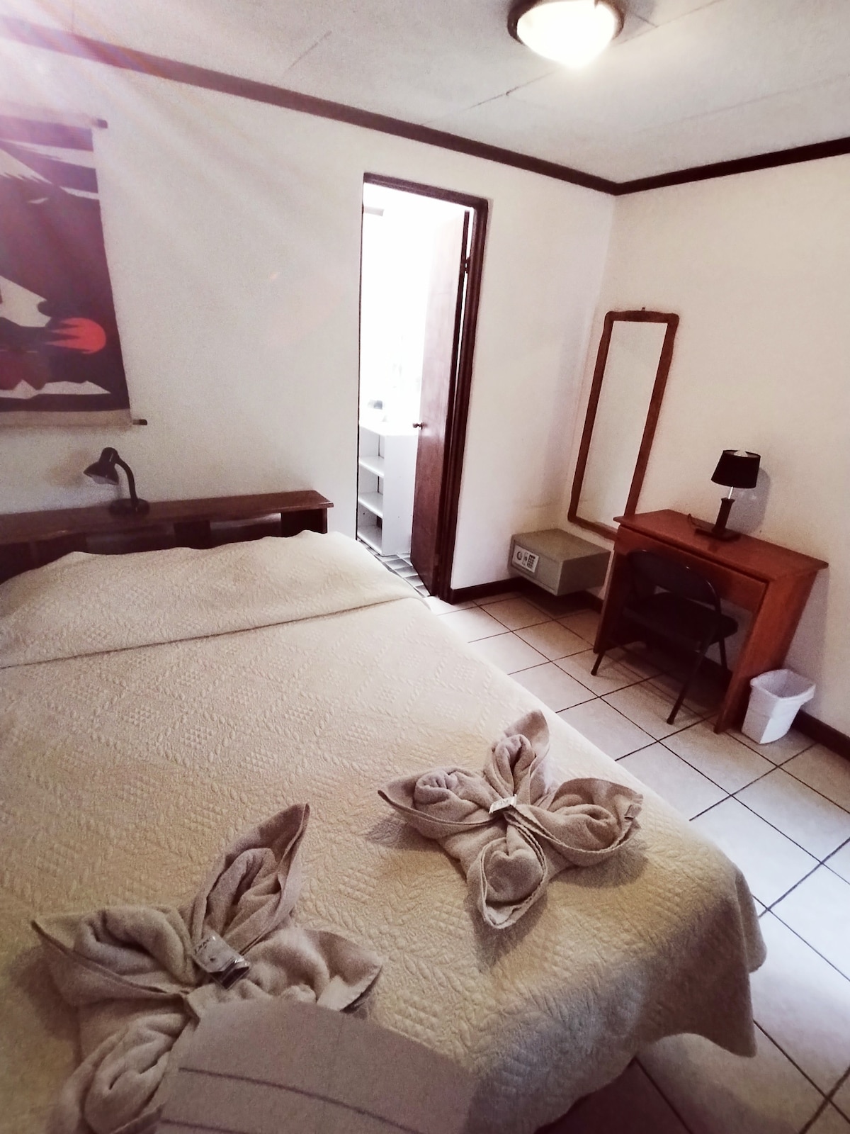 Descansa en esta acogedora habitación con cama matrimonial, baño privado y un escritorio compacto, perfecta para quienes buscan simplicidad y tranquilidad en un espacio céntrico