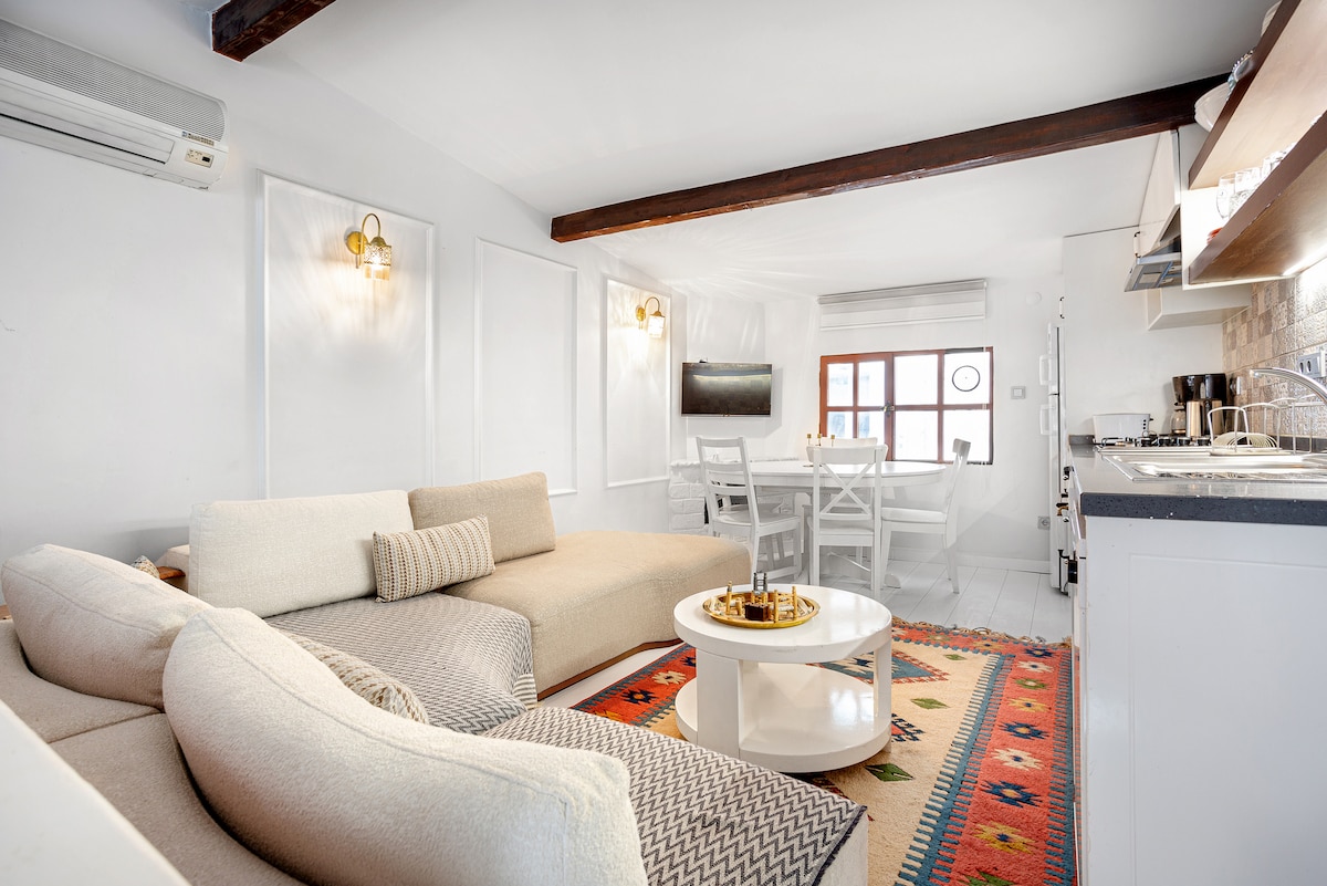 Experience the vibrant heart of Istanbul with a stay in this charming Airbnb flat located on Mis Street, a lively street with restaurants and bars just a few meters away from the famous Istiklal Street in Taksim. This cozy one bedroom flat features a private terrace that's perfect for enjoying the warm Turkish sun. Also a comfortable living room with AC, a kitchen with a mini fridge, a washing machine, coffee machine, and a barbeque on the terrace, as well as a Smart TV for your entertainment.