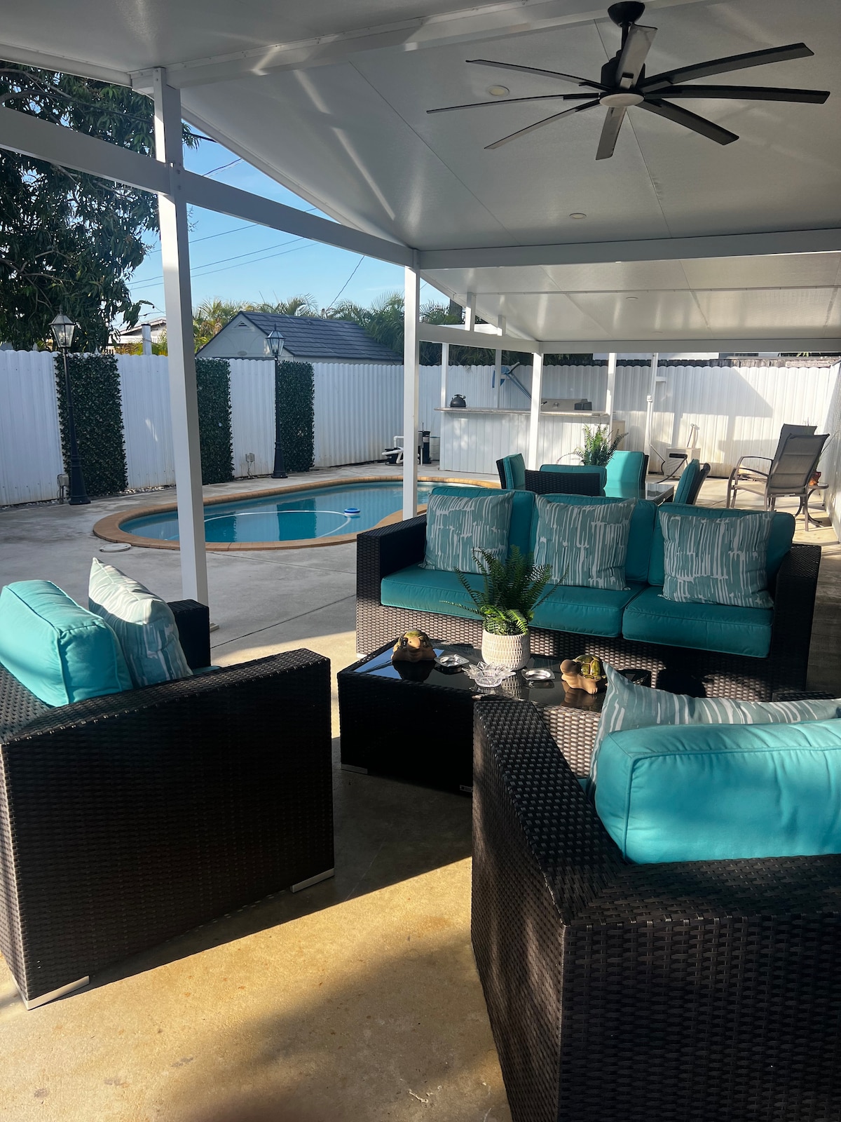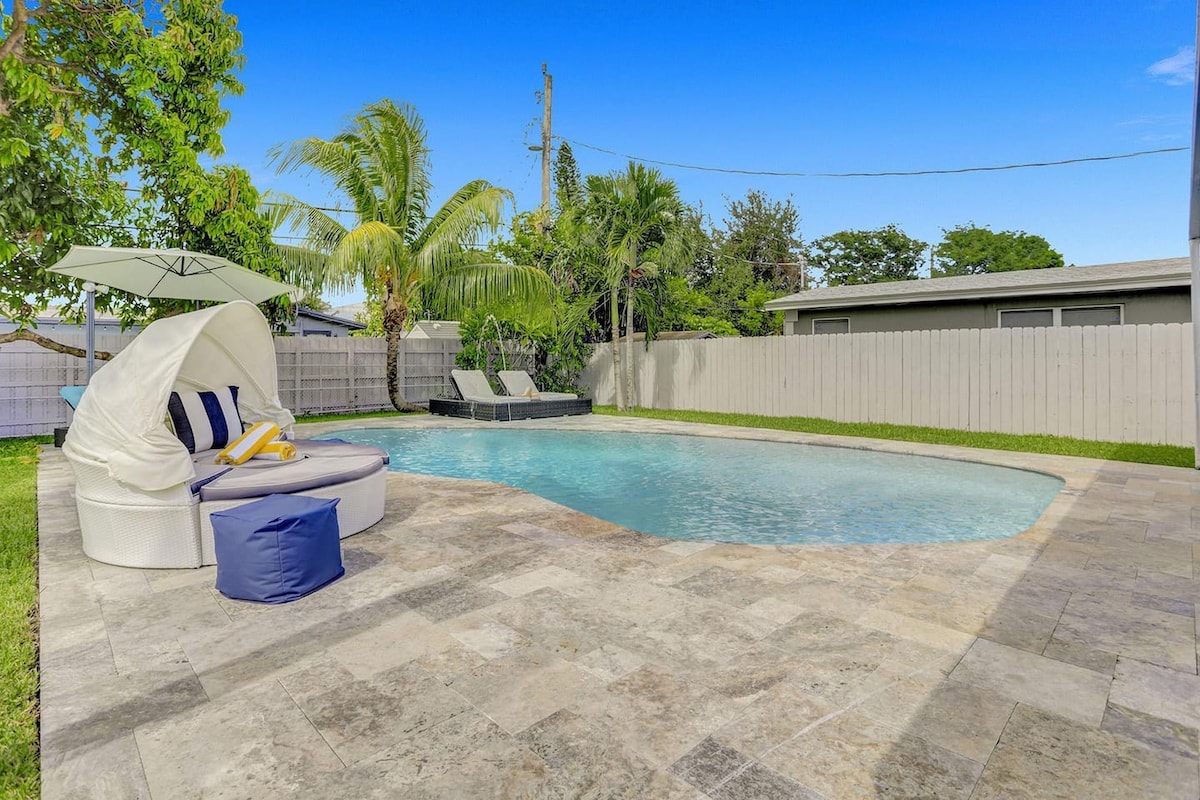 Renovated family home with 5 bedrooms and 4 full bathrooms. Heated pool year-round, mini golf, BBQ area and swing. Modern design with piano and Smart TVs. Parking for 5 cars. Prime location near airport, beaches and nightlife. Sleeps up to 16: 1 king, 2 queen, 2 full, 2 twin and 2 sofa beds (full & queen). Please confirm total guests. Add pets to reservation. Notify us if traveling with children for pool fence.
