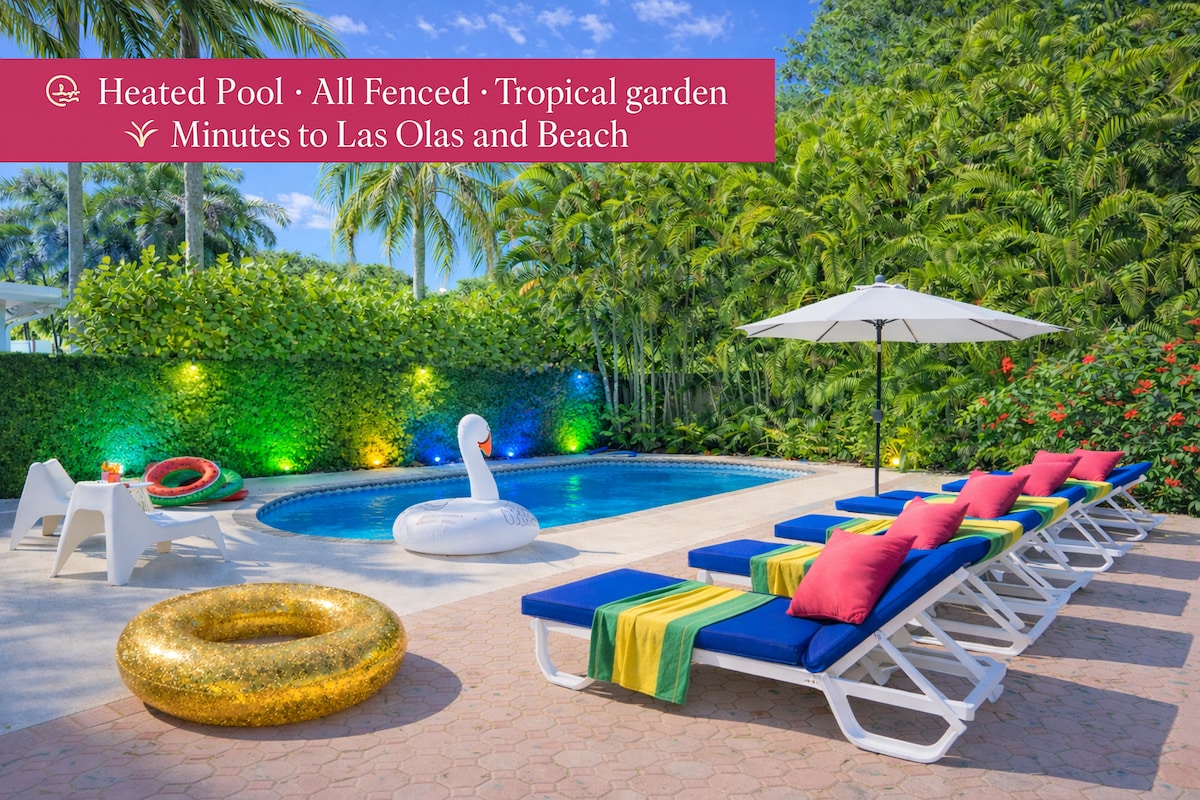 - GIANT HEATED pool with floats and amenities for everyone - HOT TUB perfect for a chilly night - ICE BARREL 400 to recover and cool off - POWER TOWER chin up and dip station - PUTTING GREEN - FIRE PIT to unwind - Hammock - N64 for 4 players - Coffee Bar - Record Player - EV/Tesla Charger, 48W - Propane Grill and Stocked Kitchen! - 7-Min drive to the beach! - Easily fits - 6 Adults and 4 Children Nows your chance to book the perfect escape for any group looking for the best in Ft Lauderdale!