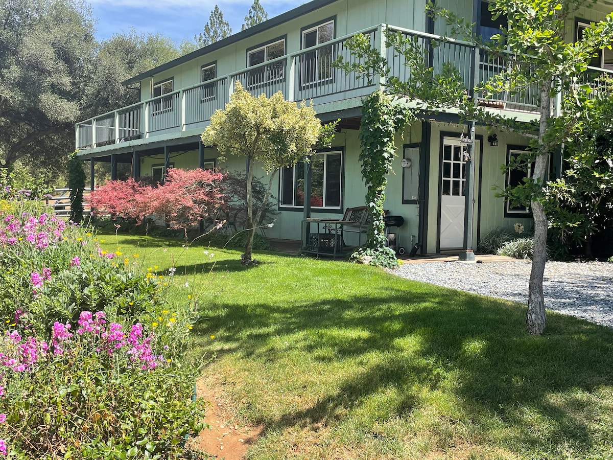 No cleaning fee! Private suite .Fish our ponds and enjoy 7 acres of serenity @ play our 9 hole discgolf! 5 minutes to downtown Grass Valley. One hour to the ski slopes of Lake Tahoe, 1 hour to Sacramento. Our house has been divided into two! We will be on one side of the house with a door separating us from the guest area. Guest area has separate entrance, it's own living room, kitchenette, 2 bedrooms and bathroom, laundry area. Pet friendly. If you have pet allergies don't be book.