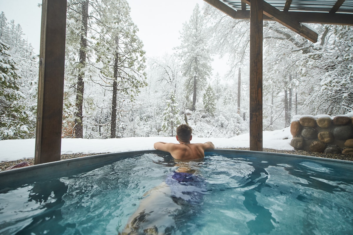 Enjoy the view of the snow capped Sierras while soaking in the hot tub, reading on the private porch, or sitting next to the cozy fireplace indoors. Private, secluded Guest Suite with private entrance. A new kitchenette has been added for convenient cooking. Play a game of shuffleboard or sip a glass of wine while sitting by the outdoor fire pit. Our home is nestled under a canopy of conifers next door to the Tahoe National Forest and only a 5 minutes drive to downtown Nevada City.