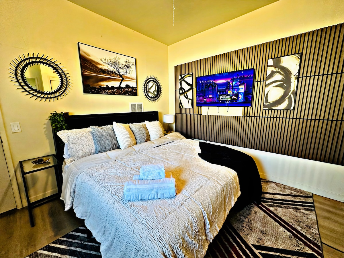This charming 1-bedroom home is a perfect blend of vintage aesthetics and modern comfort in Midtown. Step into a cozy retreat featuring restored hardwood floors, original bathroom tiles, and a working gas fireplace. The fully equipped kitchen boasts contemporary amenities. Lounge on plush furniture surrounded by cool art in the living room. Unwind in the queen-sized bed after exploring the city.