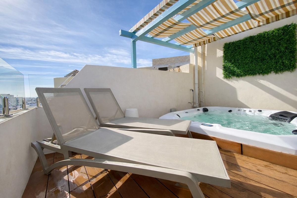 Kick back and relax in this calm, stylish space. We offer a brand new Penthouse with a private jacuzzi in Xemxija, next to of the most beautiful Bays of the Island (Golden Bay, Paradise Bay, Gozo Ferries and Cumino). The Penthouse has a large living room/kitchen with a front balcony seafront, 1 double bedroom, and 1 with 2 single beds, with air condition, wi-fi, smartTV. It's on the top Floor, with a lift. Towels and linen are included, Toaster, Hair dryer, coffee maker. NO WASHING MACHINE!