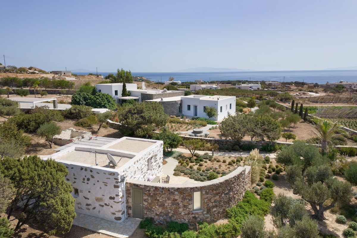 Our traditional Cycladic stone house (65 sqm.) is located in the center of the village and has a wonderful garden with Lemon, Orange, Pomegranate, Apricot, Avocado and Grape trees, where you can relax and enjoy the nature. The apartment has a panoramic view of the village and a breathtaking sea view of Naxos Island. The house is ECO-environmental friendly,suitable for work and has solar energy.The Wi-Fi is reliable for work, too. We accept longer stays. Everything you need is 20 meters on foot.