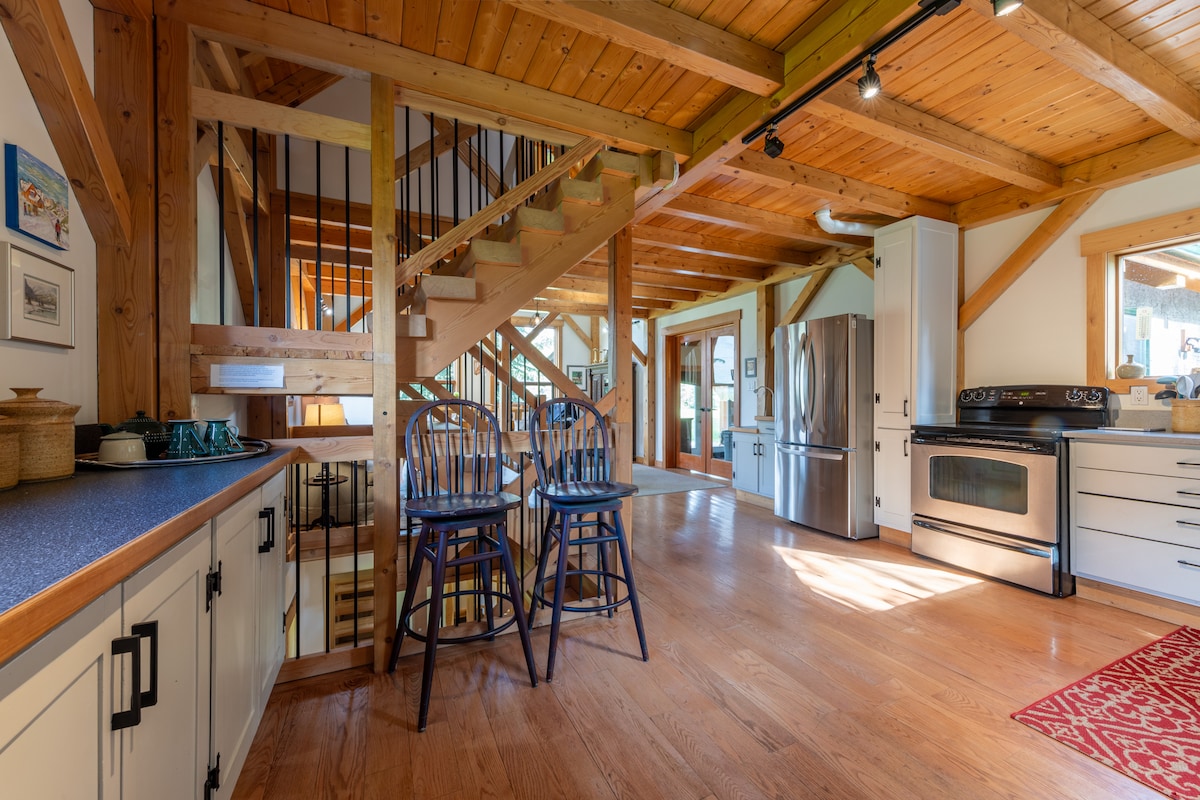 This bright one bedroom cabin holds a rustic charm set in a forested area, located just out of the town of Golden, BC. As the smallest of all the Wild Wood Cabins, the layout of Deer Crossing is cozy and compact, perfect for two guests. There is an open concept bedroom upstairs with a queen sized bed and washroom. Downstairs has the kitchen and living area sharing one open space. A pull-out-couch is included for an extra guest. Two covered decks also allow for more enjoyable times outdoors.
