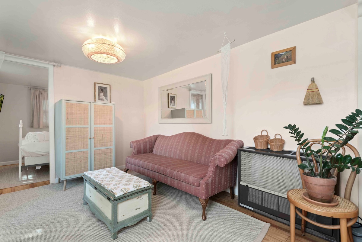 Welcome to our charming historic garden cottage, a peaceful spot nestled in the heart of Littleton. Full of natural sunlight and surrounded by vibrant flowers, hummingbirds, lush greenery, and chirping birds, it's the perfect place to relax with a good book and a cup of tea! Feeling energized? Enjoy the walking/bike path lining the property. A unique historic gem, the cottage is small, yet updated and comfortable.