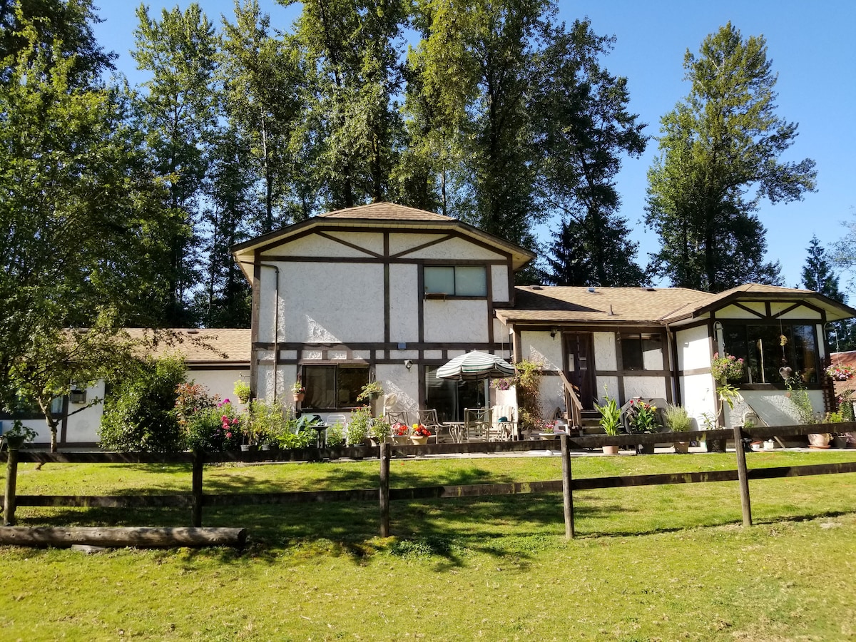 Feel at home in this charming cottage. Enjoy your morning coffee on the patio with views of fields where horses often come to the fence to visit. Sweeping vistas of the Golden Ears Mountains when you drive up to our property. A country setting nestled inside the picturesque riverfront village of Fort Langley, a 3 min drive or 15-minute walk away, where there are boutique shops, coffee shops and restaurants to visit. We are offering limited stays here - we hope you’ll plan a visit soon.