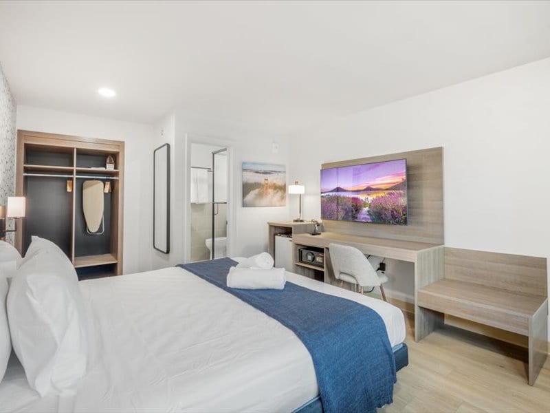 Experience comfort and convenience in this stylish San Francisco hotel room featuring King size bed, a Smart TV, and a dedicated workspace. Unwind with thoughtful touches like a spacious wardrobe, a full-length mirror, and a modern bathroom stocked with plush, high-quality towels. Pay parking is available upon request. Perfectly situated near charming parks, shops, and local dining, this inviting space is ideal for both work and relaxation during your stay in the city.