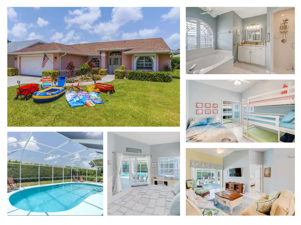 Modern 3BR/2.5BA Naples home with private pool, perfect for adults seeking comfort and fun. Sleeps 6 with king suite, queen room, and queen-over-queen bunks. Relax poolside or head to the beach with provided chairs, umbrellas, blankets, and coolers. Walk to Botanical Garden, breweries, and dining. High-speed WiFi, Smart TVs, and desks keep you connected if needed. Kid-ready with Pack ’n Play, high chair, and toys.