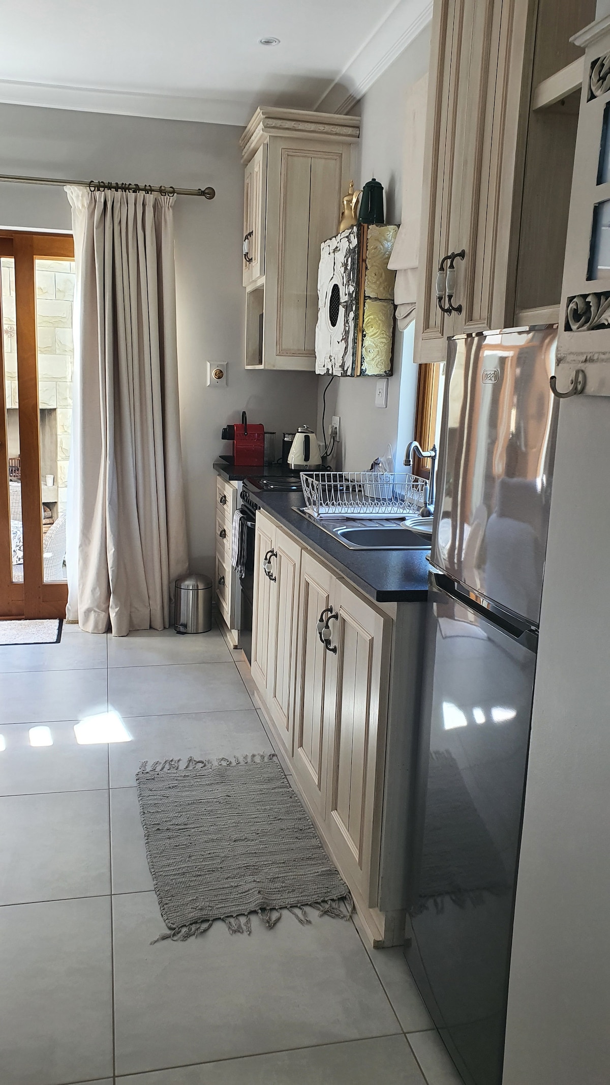 This unique place has a style all its own. One bedroom en-suite apartment joined to a main house with self catering facilities. The living area is heated by a wood burning fire place and the bedroom en-suite has an air conditioner. Braai facilities on site as well as a Smart TV with DSTV and WiFi. Two to three kms from the centre of town, on a mountain side. It is the bottom level of a three storey house but completely private and not affected by loadshedding.
