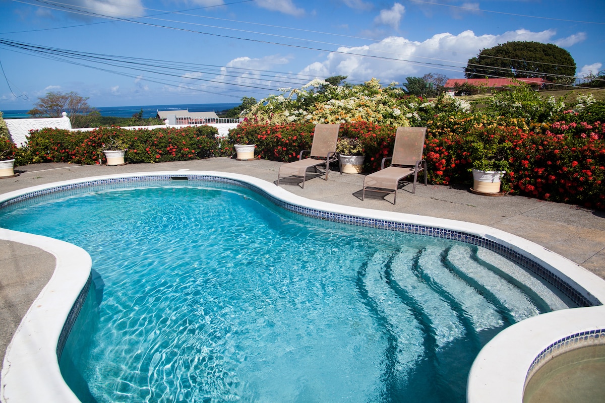 Situated on the hillside near Mt.Irvine with views overlooking Pigeon Point and Buccoo Reef. The villa has four air-conditioned double bedrooms, three ensuite. 30 foot pool is set within the exquisite gardens which has many fruit trees. Wifi included.