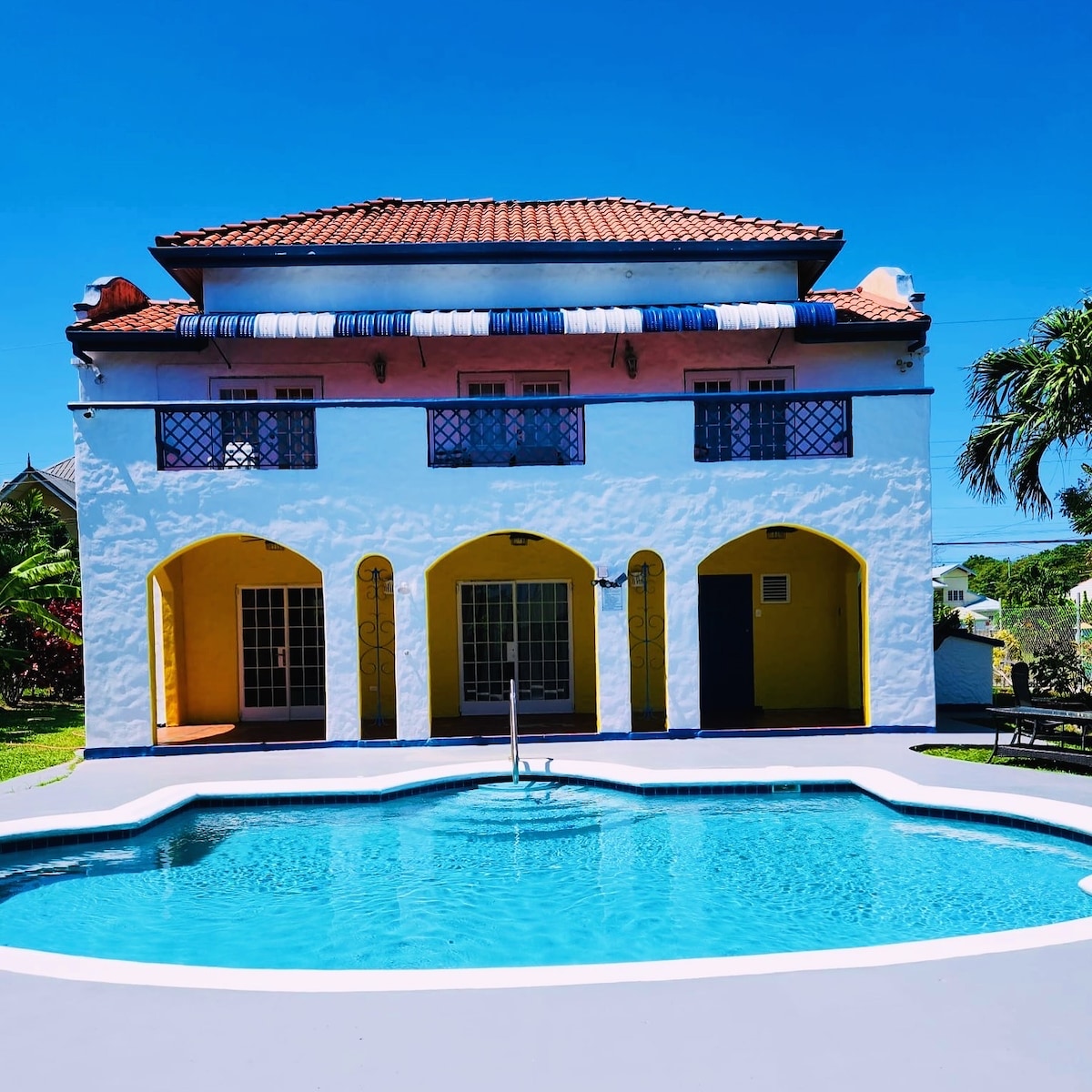 The Heart Villa in Samaan Grove, a tropical paradise with a unique heart-shaped pool ideal for groups and family gatherings. Located near all the beautiful beaches. This 5 Bedroom villa combines luxury with tropical elegance, featuring an open-plan indoor and outdoor living areas that open to a stunning pool, offering Caribbean views and breeze. Equipt rooms with en-suite baths and air conditioning. Enjoy a large gazebo with outdoor TV & BBQ area, and full amenities for a comfortable stay.