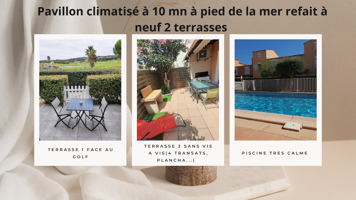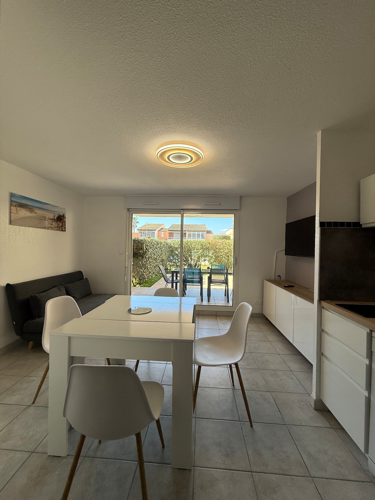 Nous vous proposons notre appartement refait à neuf situé dans une résidence calme face au golf. Son emplacement est idéal, La plage est située à 10 min à pied, le port du cap d'Agde et l'ile des loisirs sont accessibles à pied en 15 minutes maximum. Vous pourrez profitez de la piscine de la résidence. Au rez de jardin face au golf, vous pourrez profiter des 2 terrasses dont une avec 4 transats. Une place de parking dans la résidence vous est réservé