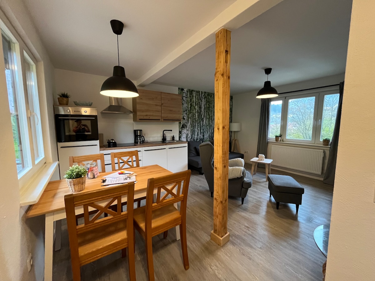 Besucht uns in unserem neu renovierten Ferienhaus auf dem über 1000 m² großen Grundstück mit direkt angrenzendem Bachlauf, überdachtem Balkon und großem Gartenbereich! Das 50 qm große Holzhaus befindet sich in ruhiger Lage am Ortsrand und wurde mit viel Liebe zum Detail aus seinem Dornröschenschlaf erweckt. Unser kleiner Rückzugsort wurde innen und außen grundlegend renoviert und neu eingerichtet. Nehmt euch eine Auszeit und ladet euren Akku bei gemütlichen Abenden am Kaminofen wieder auf :-)