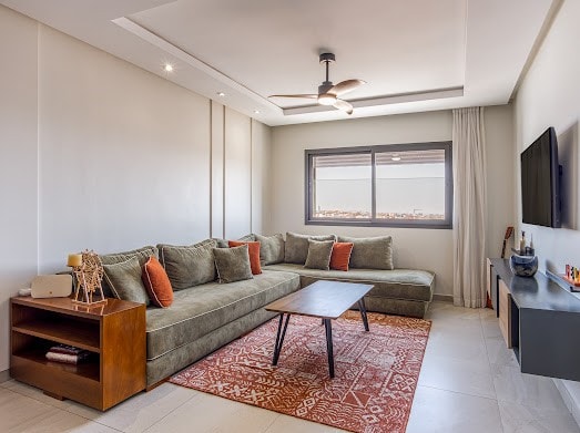 apartment, in the best area of Agadir, short walk from the beach and a short walk from the shopping center. There are some amazing and clean cafes / restaurants within walking distance of the apartment. You are secured 24 hours a day and access to 2 pools. an amazing place to live with an amazing sense of community. Suitable only for Professionals /couples and families /No men’s group will be accepted.
