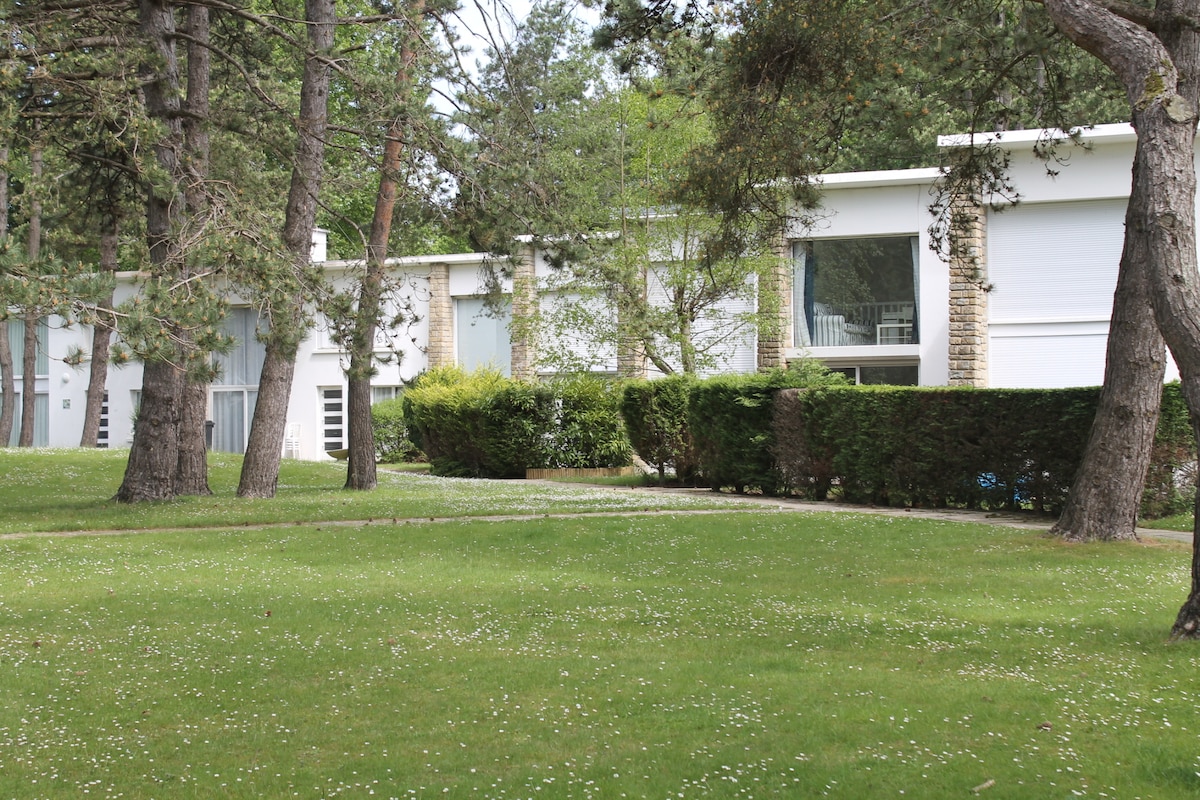 Niché au milieu des pins, vous disposerez d'un logement calme et élégant avec vue sur le golf. L'appartement dispose de : - 4 couchages : un canapé convertible avec matelas de très belle qualité et un lit "armoire" (draps non fournis) - salle d'eau avec grande douche et WC - cuisine équipée avec four, plaques à induction, lave vaisselle, réfrigérateur - grande terrasse bien exposée - place de parking privée numérotée + nombreuses places visiteurs - local à vélos fermé - WIFI - TV/Netflix