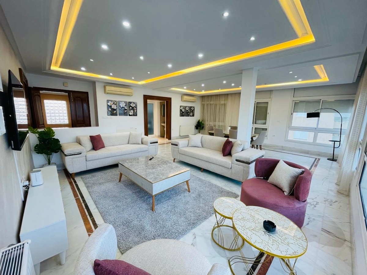 Discover a luxurious sea-view apartment in the city's heart. Wake up to Mediterranean panoramas from two bedrooms and enjoy coffee on a stunning terrace overlooking the coast. Located near The Medina and few minutes by taxi from Port El Kantaoui, this stylish space offers high-end furnishings, a well-equipped kitchen, WiFi, Smart TV, and modern comforts Two king-size bedrooms, an Italian-style bathroom, and workspace ensure a perfect urban retreat with easy access to cafés, restaurants, and bars