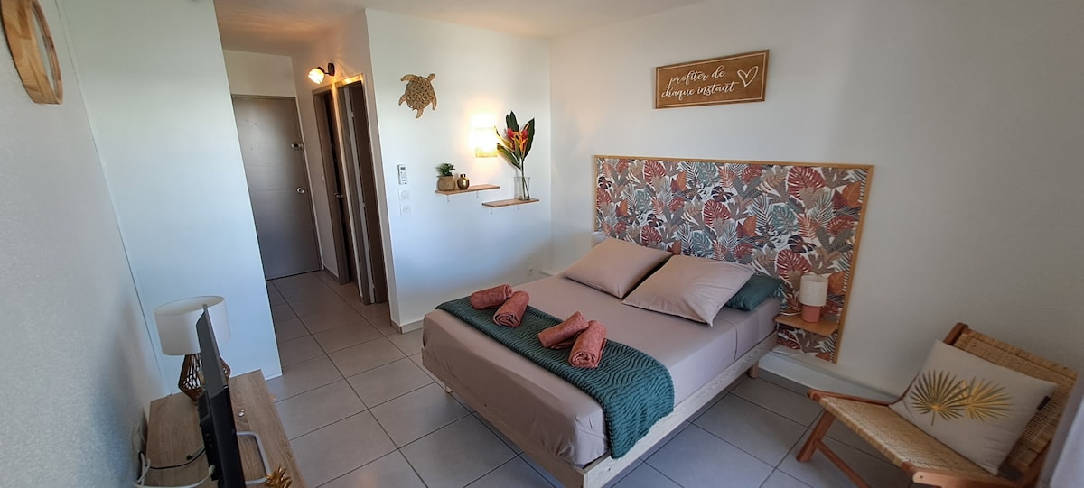Studio « Mahana ☀️ » Situé en plein cœur de la station balnéaire de St-Francois, à deux minutes à pieds de la marina, localisation exceptionnel pour profiter de vos vacances. Le studio est très cosy et bien aménagé, il allie calme, confort et proximité avec tous les commerces. La résidence dispose d’une piscine Le studio est entièrement équipé et le linge de maison est fourni ; serviettes de toilettes, draps etc… wifi, télévision, Climatisation, sèche cheveux. Ti- punch offert a l’arrivée.