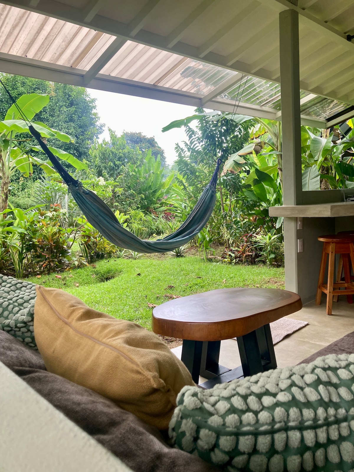 Welcome to Rooted in Love, your jungle casita with all the modern amenities to comfortably experience the jungle. This little bungalo is perfect for those wanting accessible nature yet connected to a traditional Tico village. From your room you can often observe the titi monkeys jumping tree to tree or magnificent birds on this beautiful reforested property. A yoga shala/ temple, silks, and bamboo merkaba for meditation are all available for your use. Come relax and heal in the rainforest!