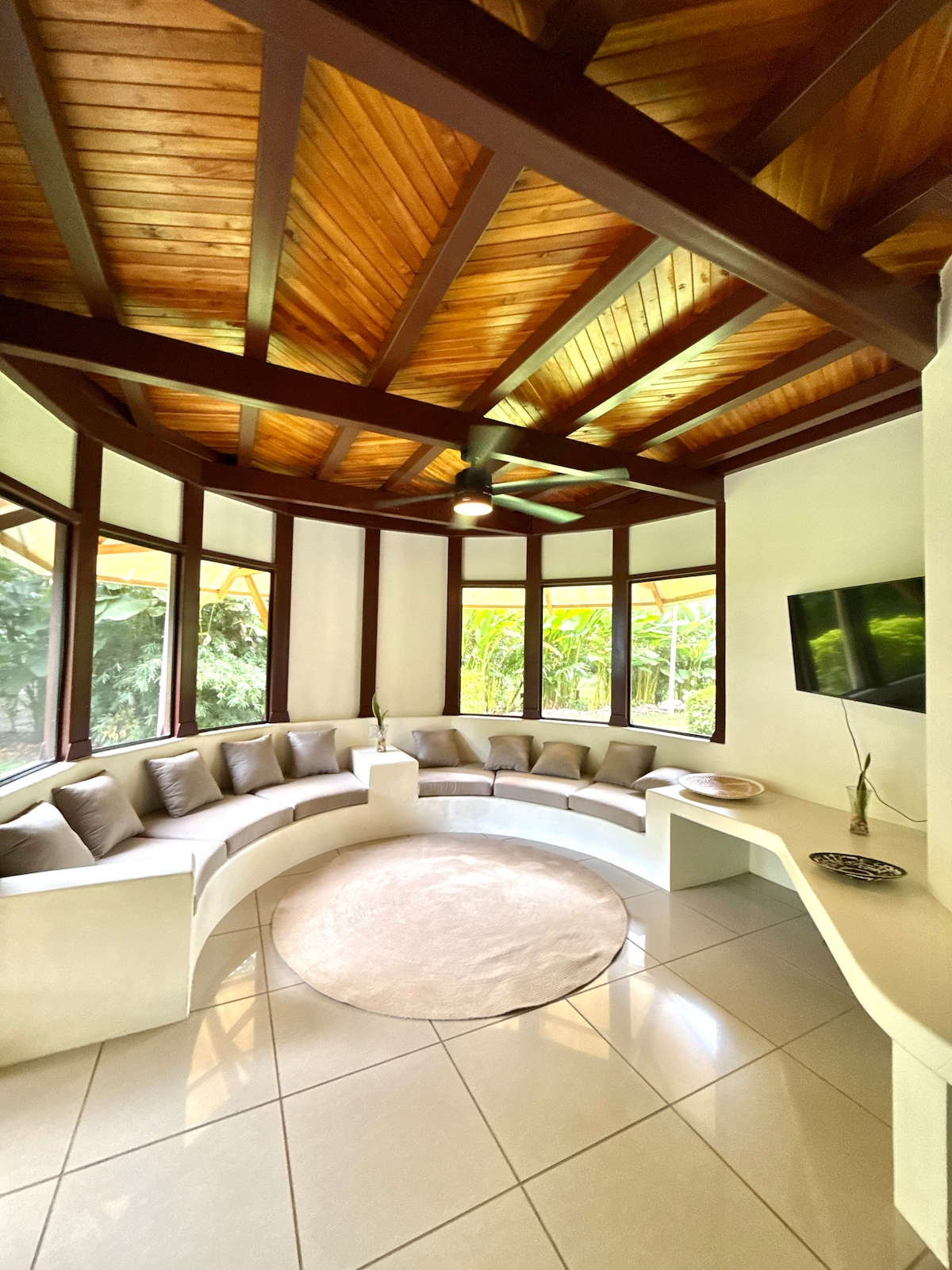 Enjoy a Pure Rainforest Escape from the comfort of our 3 level home perched 400’ above the Pacific. Cool breezes and sweeping views, this spacious 5-bedroom, 4-bath home places you at the heart of the Osa Peninsula. Calls of monkeys, toucans, and parrots wake you up early. Hike private rainforest trails and swim in deep river pools. Thoughtful Comforts & Artistic Touches with open floor plan. Screened-in bedrooms, all with fans and lights for your comfort.