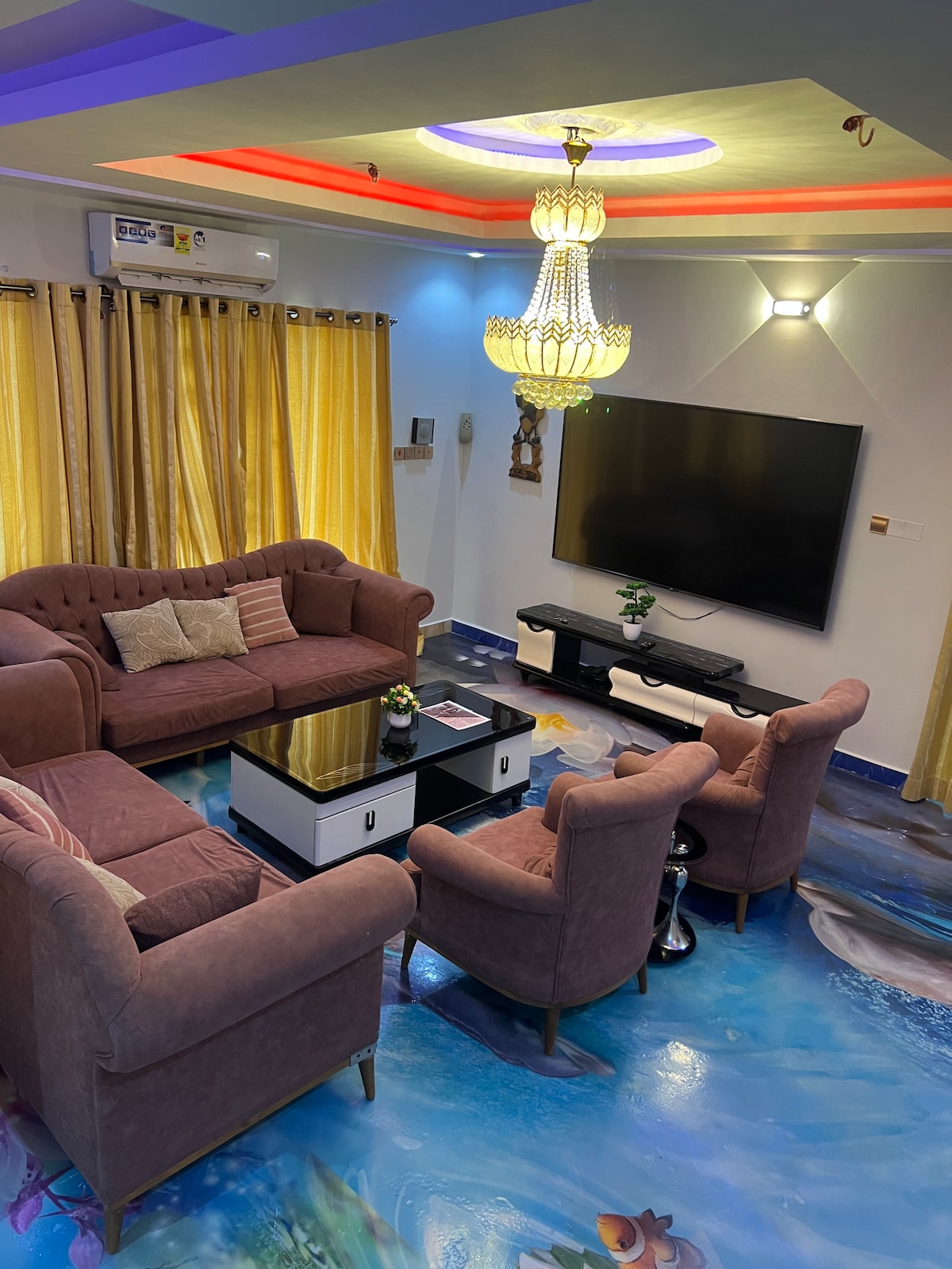 Fully renovated 2-bedroom, 2-bath duplex in a standalone home. Features a full kitchen and spacious living area. This is a private unit with its own separate entrance—no shared spaces. Equipped with modern and stylish amenities. Conveniently located just within 15 minutes from the airport and 20-25 minutes from Labadi Beach and close to popular spots like Rose Garden, Vine, Kukun, Luna Rooftop Bar, and many other top restaurants and attractions.