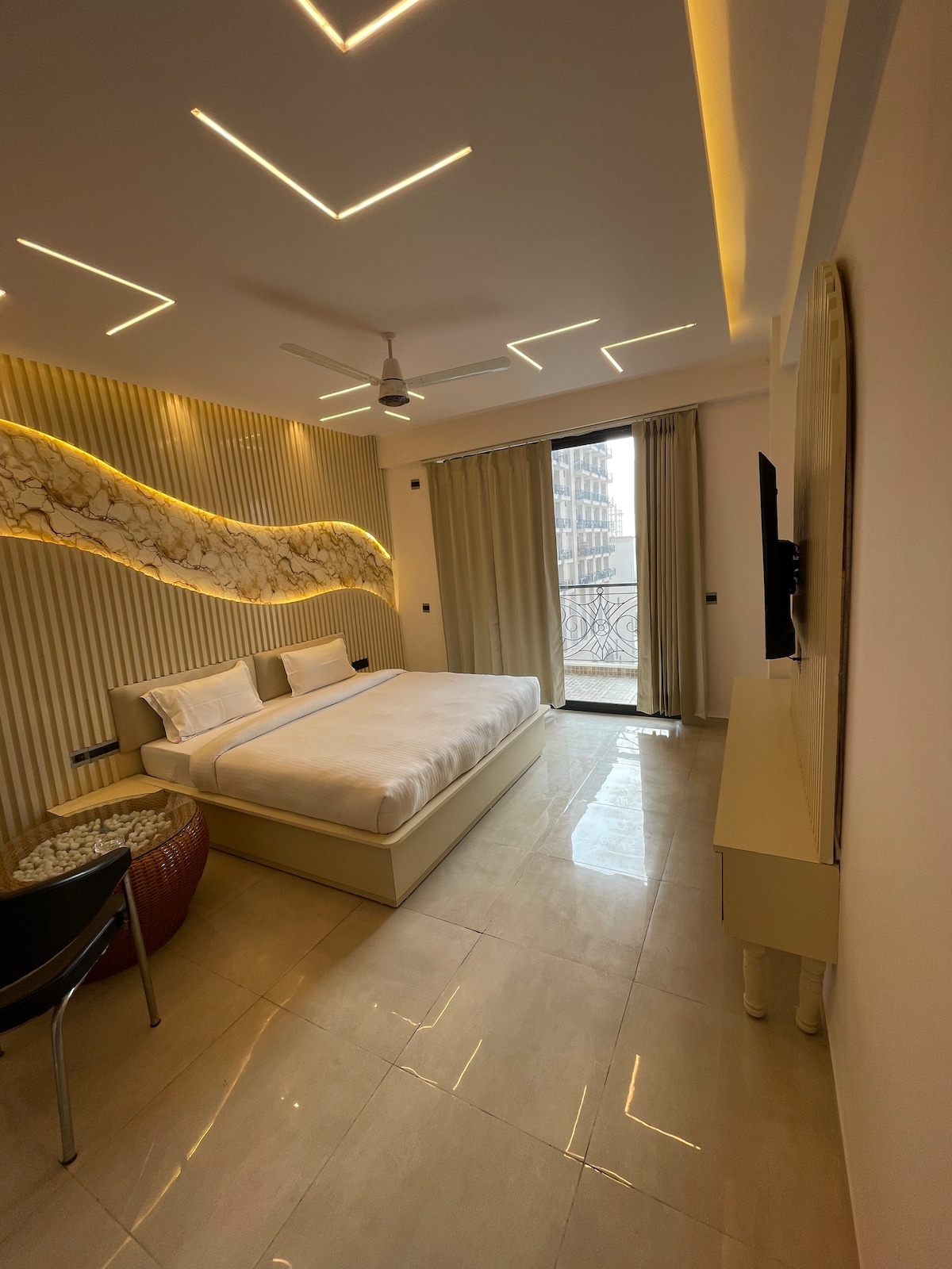 ♂Settle down in the comfort of an elegantly designed Studio apartment, even bigger than any hotel room, with the advantage of its own in-suite Kitchen, in the heart of Gomtinagar. This 2nd flr modern studio apt is ideal for 4 guests. Its large bay windows and glass balconies open up to the greenery and hustle bustle around the property. Shopping malls, supermarkets, eateries, stores, laundries etc. are mere walking distance from this place, for your convenience.