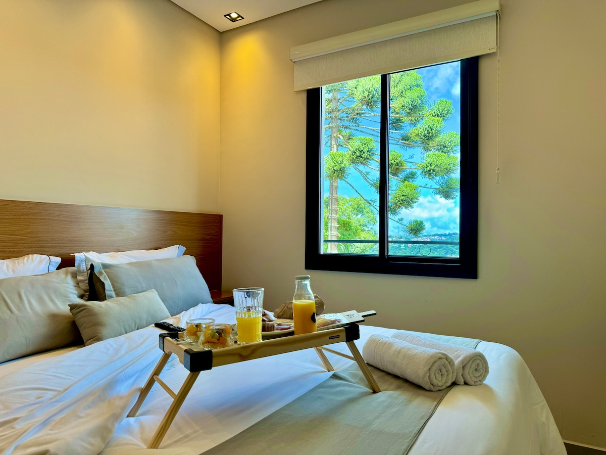 Lugar aconchegante . Localizada na porção superior de uma montanha com uma vista inspiradora. Anexo da minha casa, totalmente independente, inclusive a Hidro e piscina. Possui 2 suítes, cozinha gourmet americana, sala com TV SKY , WI-FI com Starlink (Alta velocidade) e aquecedores elétricos nos quartos. Do lado de fora, há uma piscina de borda infinita, hidromassagem, lareira de chão e total privacidade. À 900 metros do centro da cidade e totalmente asfaltada. Amamos animais !!! Nos consulte