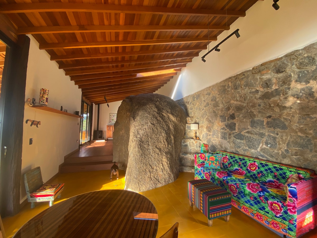 A Casa Pedra acomoda até 4 pessoas. Possui 1 suíte com cama King-Size. Sala de estar com lareira a gás, 1 Sofá cama 2 lugares (podendo ser isolado por cortinas rolo para dormir) e 1 banheiro completo. Cozinha integrada à sala. Roupas de cama de alto padrão Trousseau em algodão egípcio de 400 fios, toalhas de banho Trousseau em algodão egípcio e travesseiros de plumas de ganso. Wi-fi, Banheira de hidromassagem SPA (4 pessoas), fogão a lenha, aquecedor a óleo, Nespresso e adega climatizada.