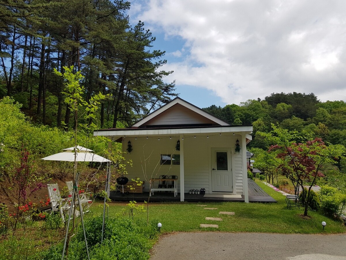 ☆☆봄이면 정원에 꽃이 만발한 정원을 가족과 산책하고, 여름이면 계곡에서 흐르는 청량한 물소리와 함께, 야외 어린이용 수영장을 비용없이 단독으로 사용할수 있고 가을이면 계곡에서 불어오는 시원한 바람과 울긋불긋 단풍을 즐기고 겨울이면 모닥불에 고구마 밤도 굽고, 비용없이 사용할수 있는 바베큐징비를 사용할수 있지요. 눈이 내리면 는내린 오솔길을 친구와 걸어보아요 ☆☆23평의 친환경 목조주택에 편의시설이 완비되어 있습니다.무더운 여름, 거실과 안방에 에어컨과 선풍기2대가 있고 침대엔 듀라텍스 냉감쿨패드도 준비되어 있습니다. 또한 햇반을 사오시지 않게 쿠첸밥솥과 쌀도 냉장고에 준비해 놨습니다. 언제든 먹거리만 준비해 오셔서 편안한 힐링 의 시간을 보내세요. ☆☆가까운 거리에 화양계곡, 설운산, 공림사,산막이 옛길등이 있고 5분거리에 농협을 비롯 대형마트,청천재래시장,숲카페, 맛난 식사를 할 수있는 식당이 있습니다.