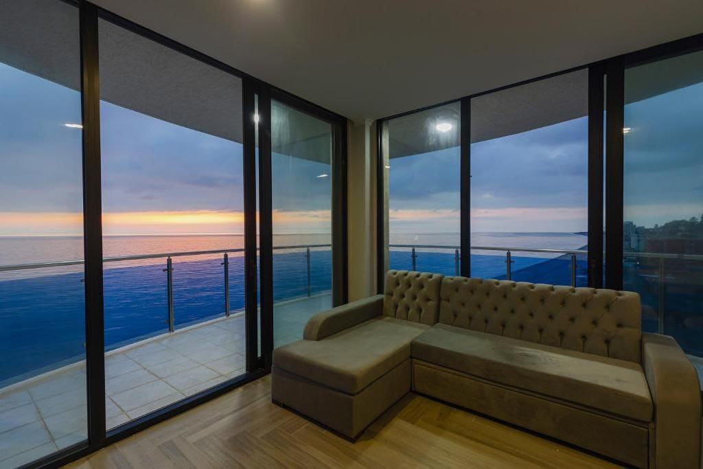 Brand new apartment located right on the Beachfront, underneath of Mountains. All room have balconies with a fantastic sea view, plenty of light and space. Apartment has Equipped kitchen , 2 bedrooms ( one with double and one with 2 single beds), 1 living room with a convertible sofa. High speed free WiFi, flat screen Cable TV, Washing and Drying machine, Air conditioning, Heating for all year stay. Free parking, market, kids playground, billiard and restaurant are available on the ground level.