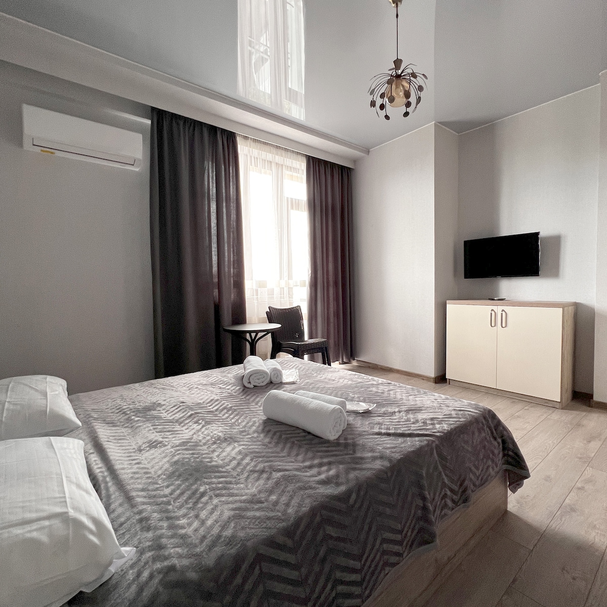 Relax in a cozy, calm and stylish place directly on the shores of the Black Sea. Amazing views of the sea, mountains and sunsets! Access to the beach, pool, cafes, shops and restaurants.