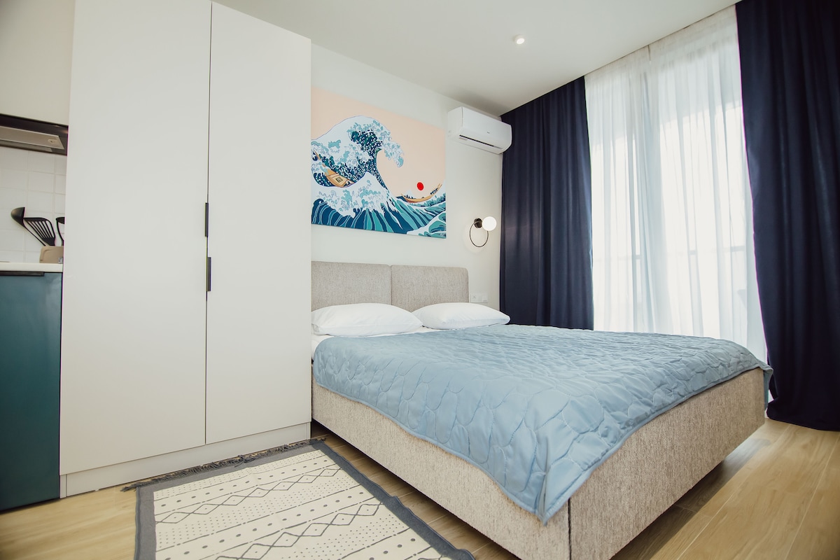 Relax in a cozy, calm and stylish place directly on the shores of the Black Sea. Amazing views of the sea, mountains and sunsets! Access to the beach, pool, cafes, shops and restaurants.