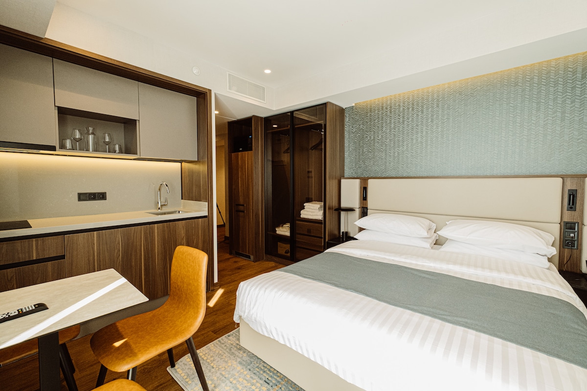 Relax in a cozy, calm and stylish place directly on the shores of the Black Sea. Amazing views of the sea, mountains and sunsets! Access to the beach, pool, cafes, shops and restaurants.