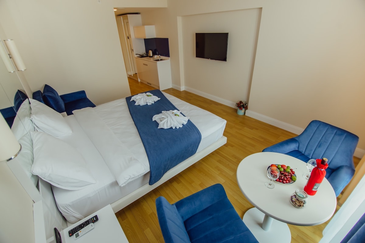 Enjoy a beautifully furnished apartment designed for 1–2 guests, located in the prestigious Solis Residence Aparthotel. Situated just steps away from Batumi Boulevard and the beach, the apartment offers breathtaking sea views from the 14th floor. The apartment includes: One double bed and a convertible armchair Large windows & balcony with panoramic sea view Sun lounger on the balcony for relaxation Shops and dining options right next to the building Paid parking and city parking nearby