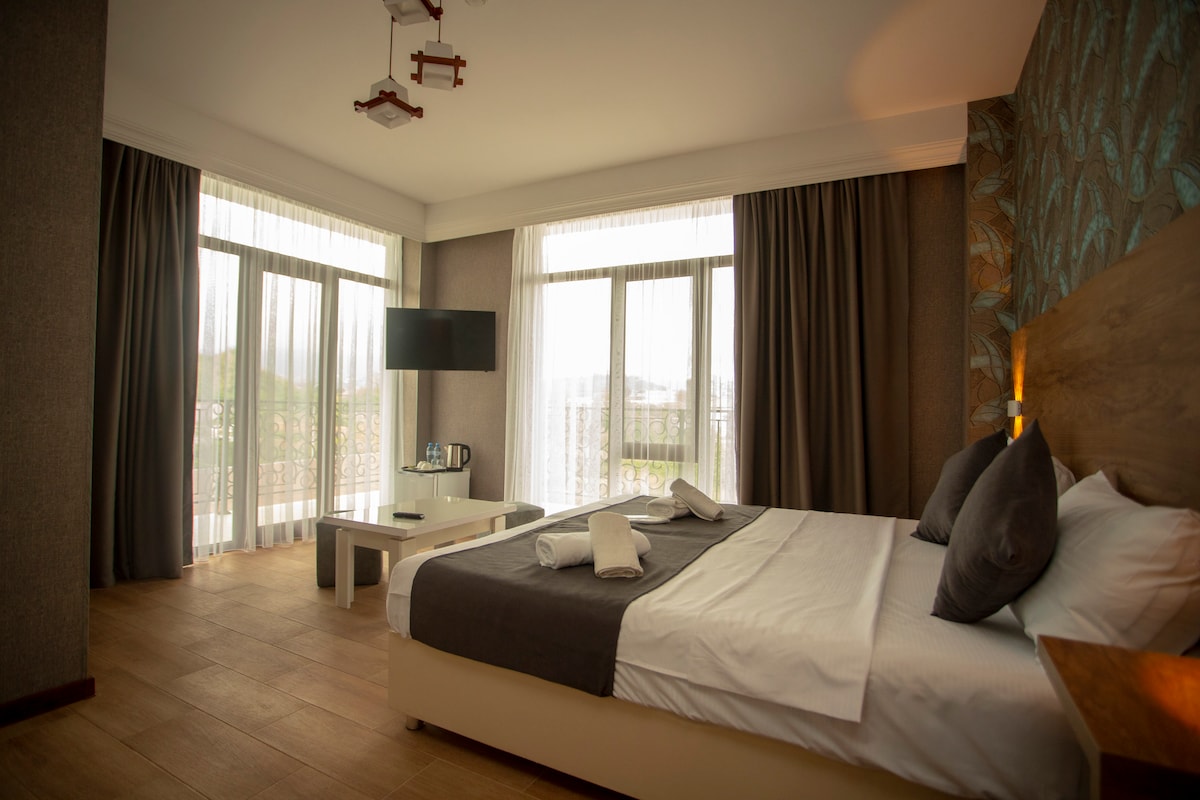 Welcome to Green Heaven – a calm, hotel-style room with balcony and access to a newly built shared drop pool surrounded by nature. Designed in soft blue tones, it’s perfect for solo travelers or couples seeking peace and comfort. Enjoy the fresh air, relax in a cozy bed, and stay connected with Wi-Fi and smart TV. While there’s no kitchen, great cafés are nearby. A quiet retreat just minutes from Batumi’s center.