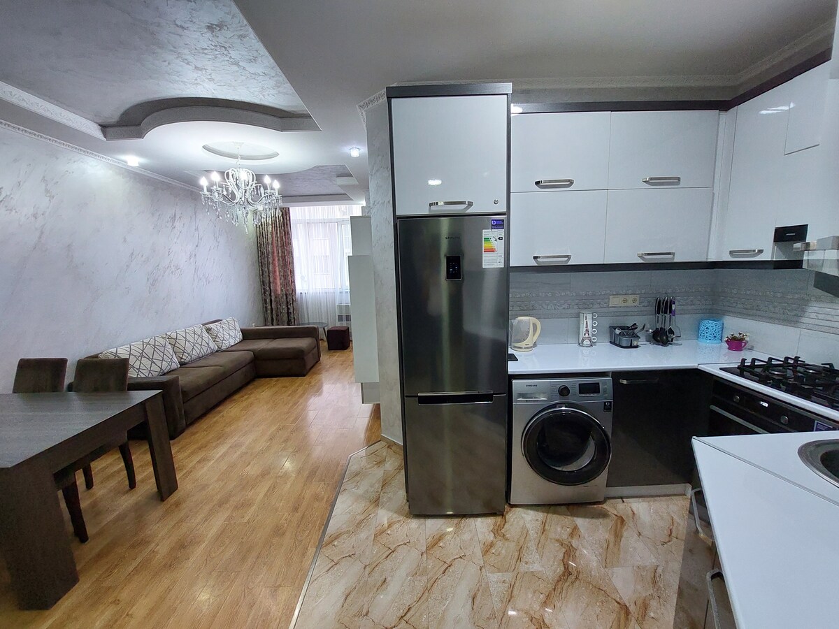 Alliance Palace VIP Apartment is located on the first line, 100 meters from the beach, with a beautiful view of the singing fountains and the building of justice. It offers free Wi-Fi, a 24-hour front desk, many restaurants and bars nearby, and 2 hypermarkets. The room has air conditioning, flat-screen satellite TV, washing machine, microwave, refrigerator, kettle, hairdryer, mosquito net, wardrobe, large balcony, private kitchenette and bathroom.