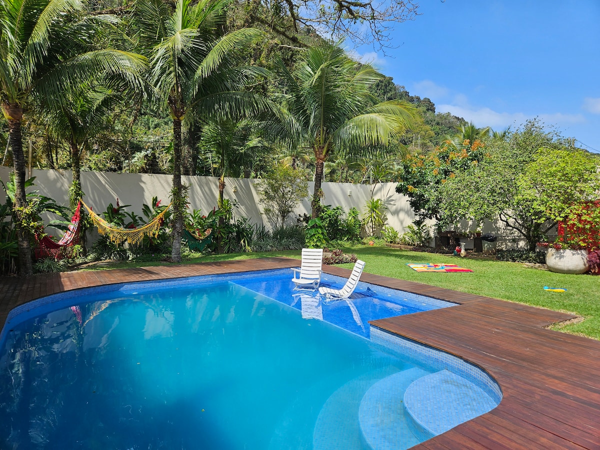Casa aconchegante com vista para montanha na Praia do Guaiúba que é uma área de reserva ambiental. 3 minutos a pé da praia. São 3 quartos, sendo uma suíte e mais dois banheiros, com uma sala de estar/jantar e mais uma sala de televisão. Ao lado da piscina, há uma área coberta para CHURRASCOS. . Temos mais um terraço coberto. O Guaiúba é uma pequena praia de ruas de TERRA, ideal para famílias que gostam de natureza e desejam descansar,. Estacionamento COBERTO E FECHADO PARA 3 CARROS.