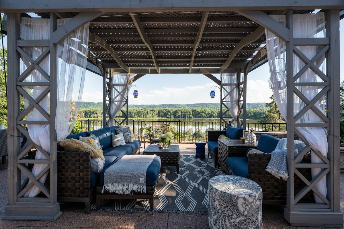 Castle Vüe Villa isn’t just a place to stay—it’s your private luxury retreat. Perched above the Mississippi backchannel, this elegant home was designed for life’s most memorable moments. Whether you're here for a wedding or a peaceful escape, we invite you to settle in and stay awhile. – Sleeps 8 | 4 bedrooms – Perfect for gatherings – River views – Chef’s kitchen – Spa-style baths – Elegant, cozy design – Sunroom, fire pit & more – Quiet bluff | 10 min to Red Wing – Pups welcome