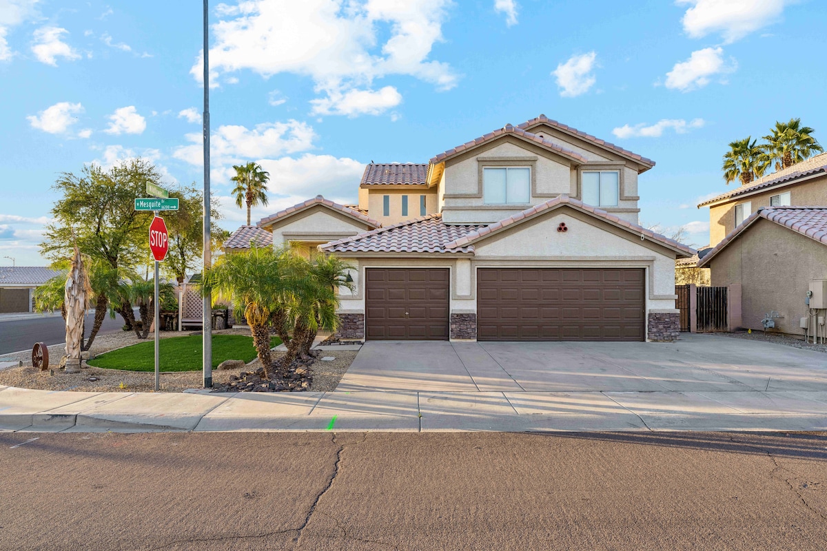 Goodyear Getaway: Heated Pool, Pizza Nights & Pool Table Fun! 5BR/3.5BA sleeps 12! 🔥 Optional heated pool ($90/night, 2-night min, 48hr notice). ⛳ Turf putting green, 🍕 wood-fired pizza oven, 🔥 gas fire pit, 🥞 Blackstone griddle, 🎱 pool table, 🌧️ luxe rain shower. 8 min to Spring Training, 20 min to Westgate. No pets/parties. Check-in 4PM—your vacay starts NOW!