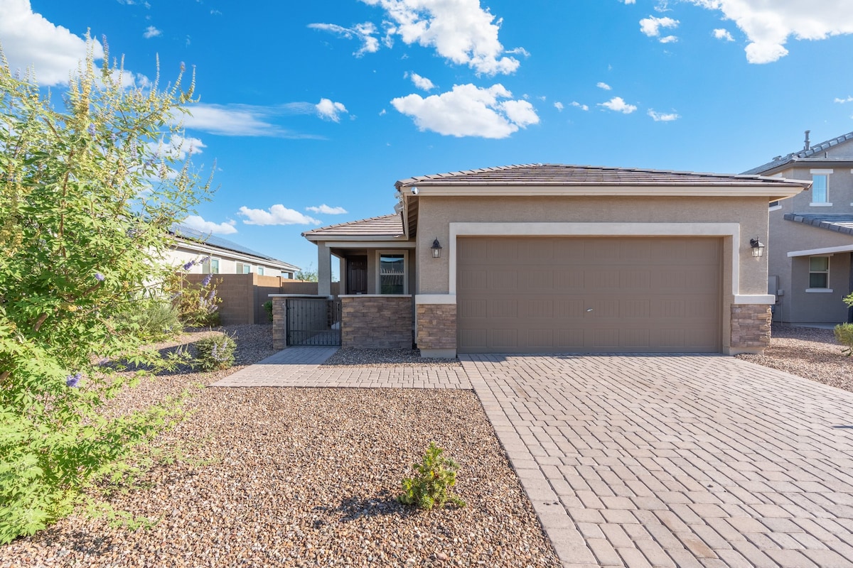 Amazing outdoor space with FREE HEATED POOL! No charge for heating the pool! Beautiful, Luxurious Resort-style home located in Goodyear in Estrella Mtn Ranch. Beautifully appointed home with nice furnishings. Located in a gated golf course community where you can go hiking in the regional park, stargaze at the Star Tower, or play golf at Estrella's beautiful course, which Jack Nicklaus designed. Watch the Arizona Cardinals, Diamondbacks, Coyotes, or any of the spring training games!