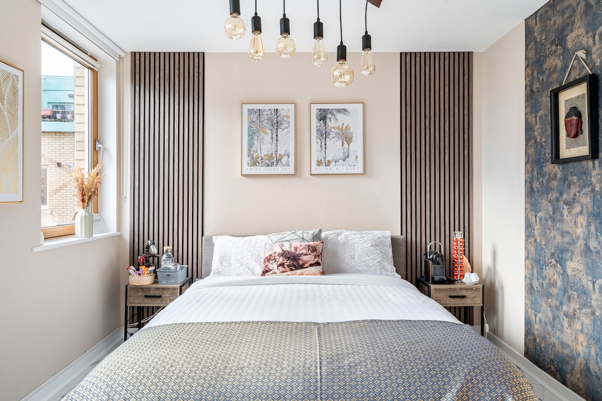 平均评分 4.96 分(满分 5 分),共 28 条评价4.96 (28)格拉斯哥市中心套房顶层公寓,配有 55 英寸电视、共用厨房和免费停车位